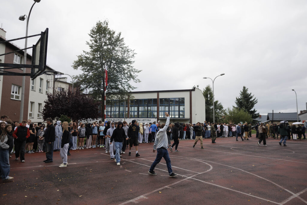 Podczas briefingu prasowego niespodziewanie ogłoszono sygnał alarmowy. Wszyscy obecni w budynku rozpoczęli natychmiastową ewakuację i w krótkim czasie zgromadzili się w wyznaczonym miejscu przed szkołą.