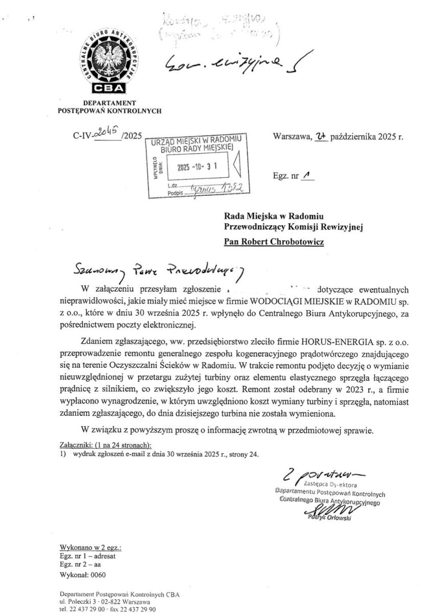 Zgłoszenie wpłynęło do CBA 30 września. Zdaniem sygnalistki wykonawca remontu w 2023 r. na terenie oczyszczani ścieków miał wykonać prace nieuwzględnione w przetargu, za co odebrał wynagrodzenie, a do dziś nie dokonał wymiany opłaconych urządzeń. Chodzi konkretnie o remont zespołu kogeneracyjnego prądotwórczego w oczyszczalni ścieków, podczas którego miała zostać wymieniona turbina oraz element elastycznego sprzęgła łączącego prądnicę z silnikiem, co skutkowała zwiększeniem kosztu remontu.