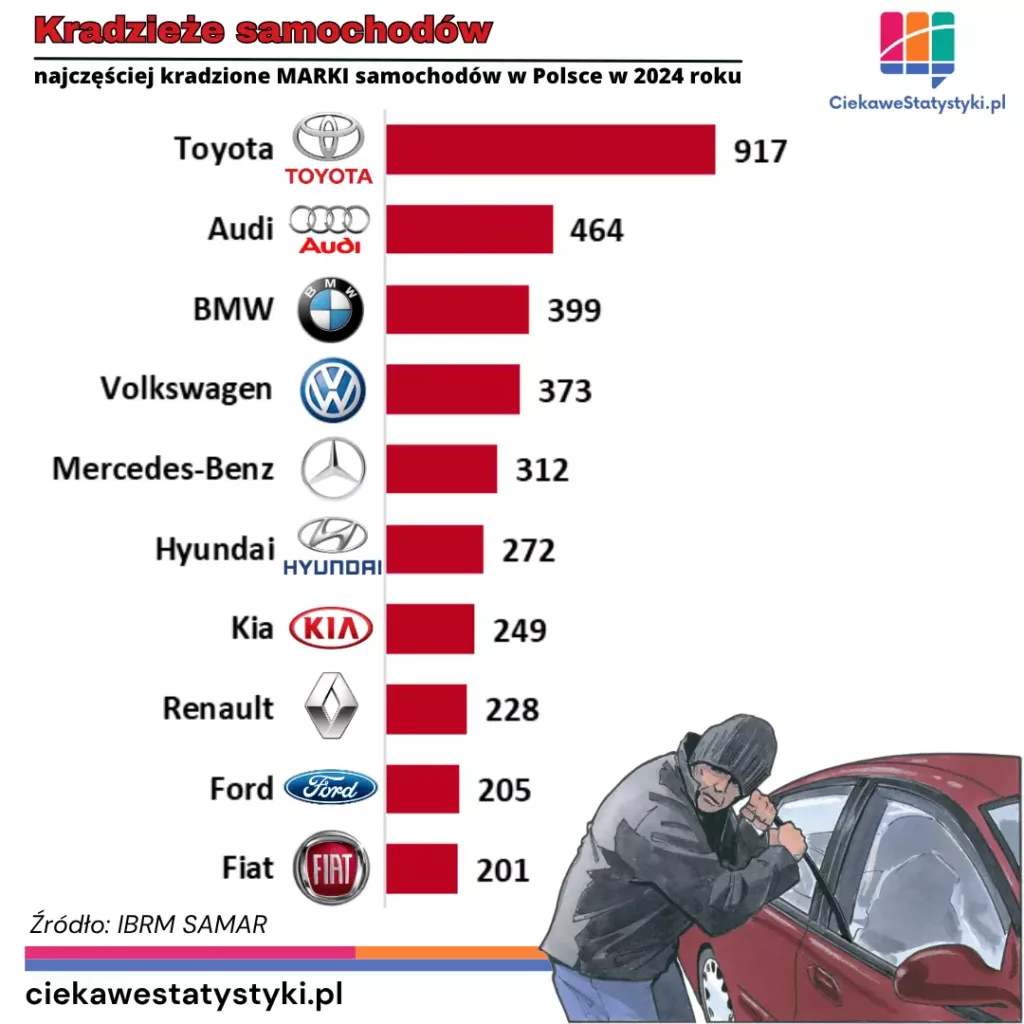 - W 2024 roku w Polsce złodzieje najczęściej kradli samochody marki Toyota oraz Audi.