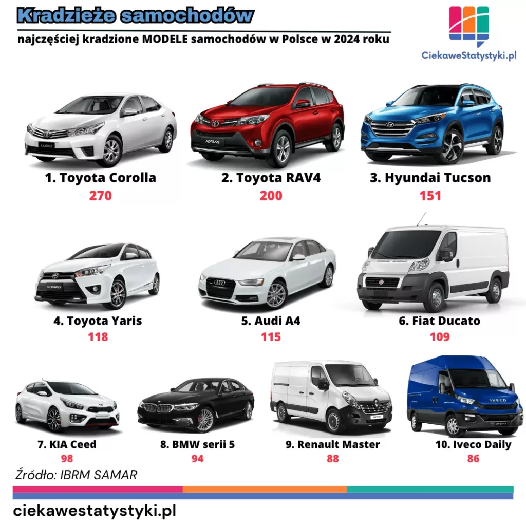 Najczęściej kradzione modele samochodów w Polsce w 2024 rokuOpracowanie ciekawestatystyki.pl na podstawie raportu IBRM SAMAR