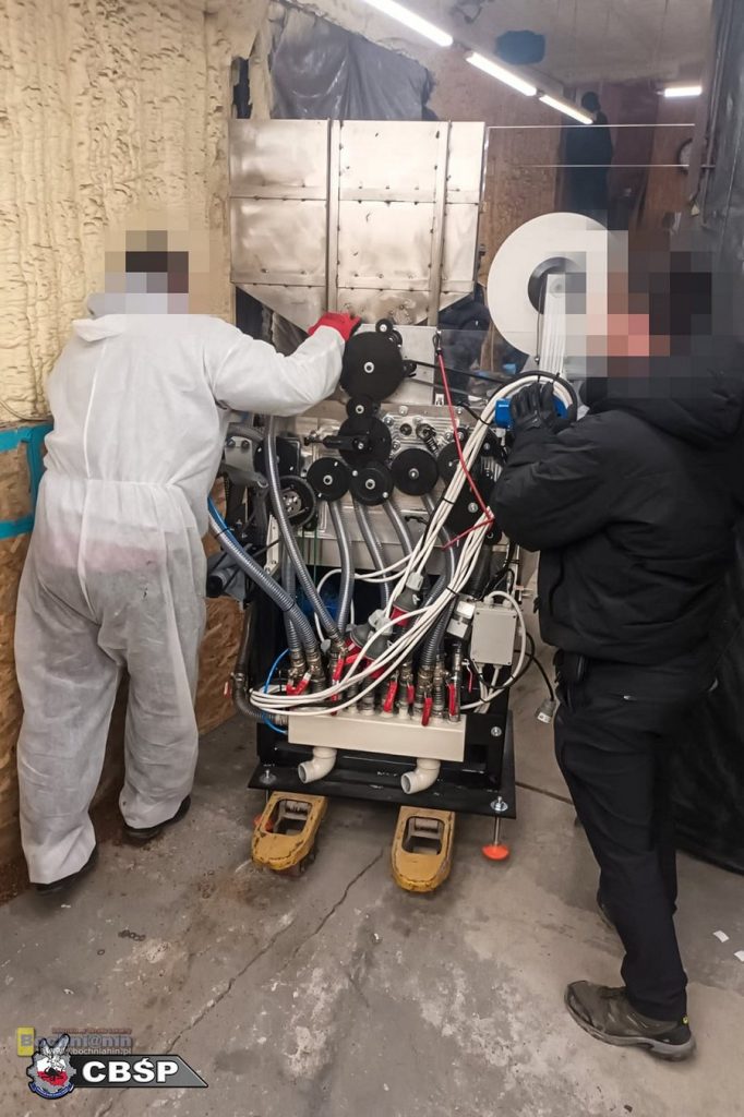 Na miejscu odkryto w pełni wyposażoną halę produkcyjną z profesjonalną linią technologiczną służącą do wytwarzania wyrobów tytoniowych. Podczas przeszukania zabezpieczono maszyny i komponenty do produkcji papierosów oraz około 380 kilogramów tytoniu bez polskich znaków akcyzy.