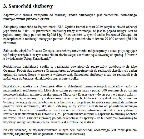 "Zapewnienie środka transportu do realizacji zadań służbowych jest elementem normalnego funkcjonowania przedsiębiorstwa. Zakupiony samochód to Pojazd marki KIA Optima kombi z roku 2019 (czyli w chwili obecnej jego wiek to 7 lat - w przestrzeni medialnej krąży informacja, iż jest to pojazd nowy). Jest to pojazd, który służy potrzebom Spółki i jej Pracowników w tym również Prezesowi Zarządu do zabezpieczenia realizacji bieżących potrzeb. Zakup samochodu to kwota 70 000 zł netto (86 100 zł brutto). Zakres obowiązków Prezesa Zarządu, czas ich wykonywania, miejsce pracy a także przysługujące tej funkcji narzędzia (w tym samochodu służbowego) określone są w zawartej ze spółką "Umowie o świadczenie Usług Zarządzania".