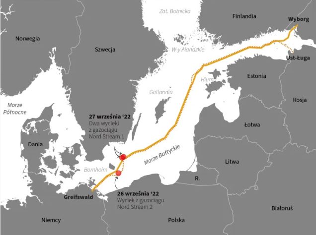 Miejsca, w których zostały uszkodzone rurociągi North Stream 1 i 2