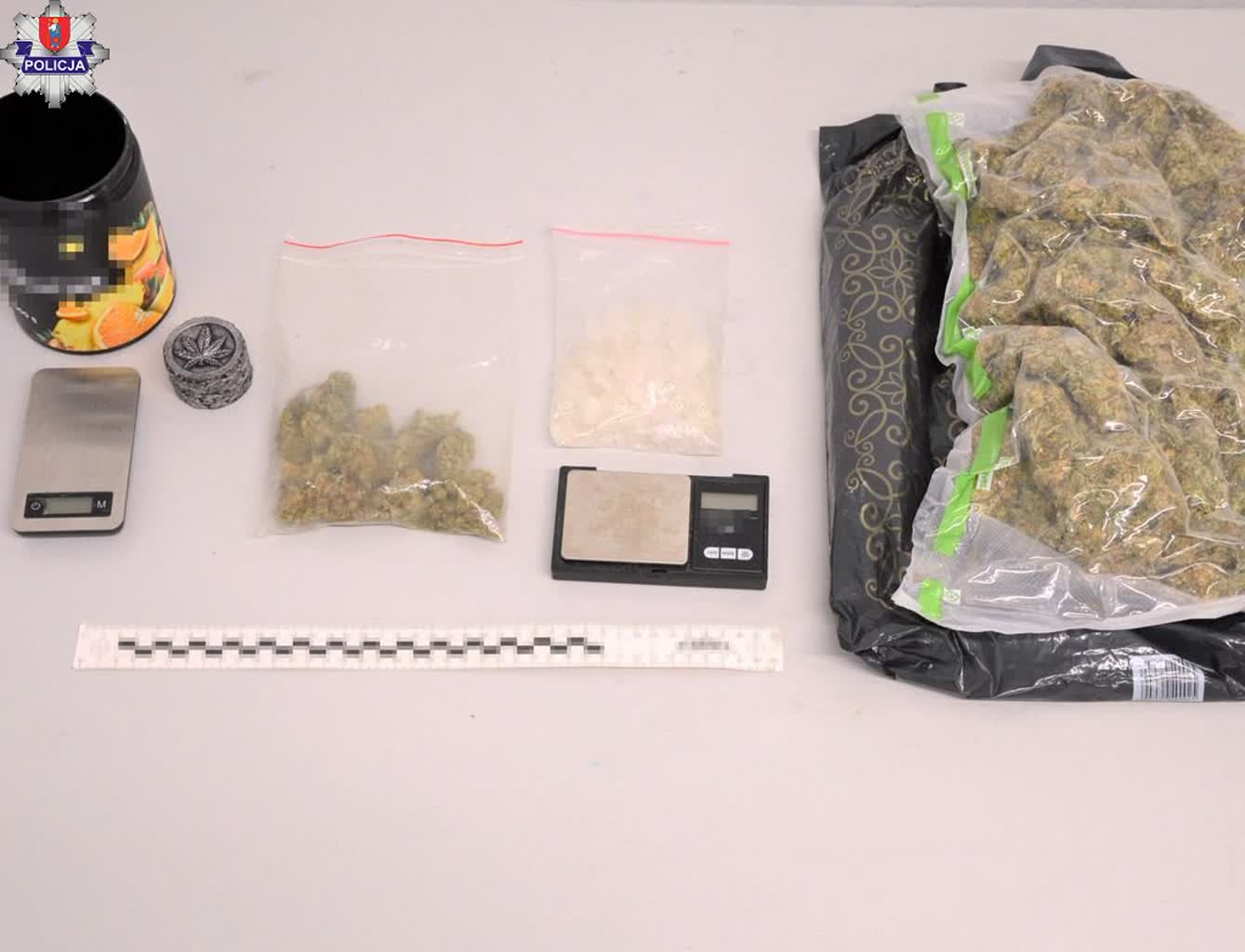 W szafce chłopak trzymał plastikowe pudełko i foliowy worek z suszem roślinnym. Mundurowi odnaleźli też wagę elektroniczną i młynek wykorzystywany do rozdrabniania suszu. Policjanci przeszukali również przynależną do mieszkania piwnicę, w której odnaleźli reklamówkę z suszem, worek foliowy z krystaliczną substancją i kolejną wagę.