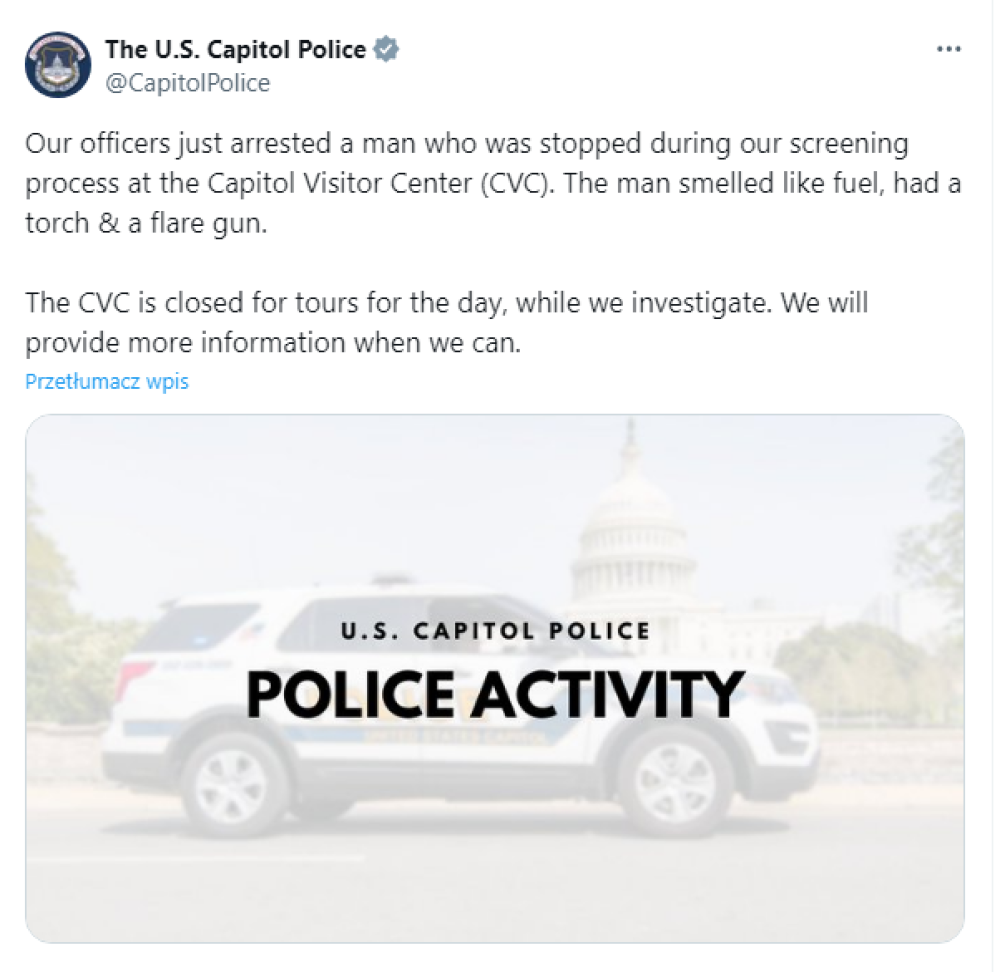 Jak podała we wpisie na platformie X Policja Kapitolu (USCP), mężczyzna, od którego czuć było woń benzyny, został zatrzymany przy wejściu do centrum dla zwiedzających (Capitol Visitor Center), skąd rozpoczynają się wycieczki po kompleksie Kapitolu.