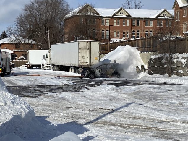 W pobliżu Kipling Avenue, na północ od Woodbridge Avenue, widać spalony pojazd.