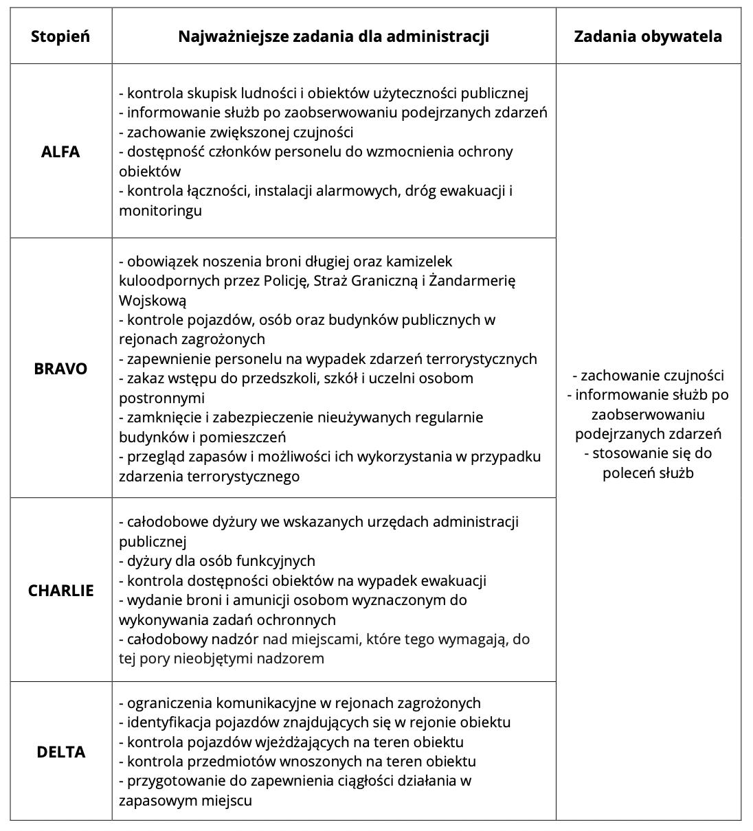Zgodnie z ustawą o działaniach antyterrorystycznych, w przypadku wystąpienia zdarzenia o charakterze terrorystycznym lub zagrożenia takim zdarzeniem można wprowadzić jeden z czterech stopni alarmowych: