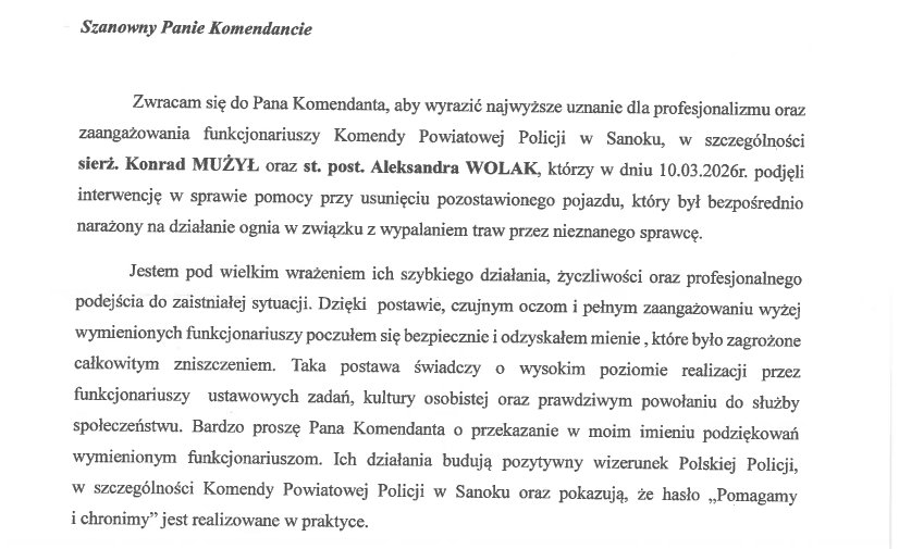 „Zwracam się do Pana Komendanta, aby wyrazić najwyższe uznanie dla profesjonalizmu oraz zaangażowania funkcjonariuszy...” – tymi słowami rozpoczyna się list, który wpłynął do sanockiej komendy. Mieszkaniec podziękował policjantom za błyskawiczną akcję, dzięki której jego samochód nie spłonął podczas pożaru nieużytków.