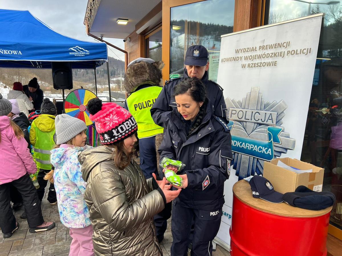 W trakcie ferii zimowych lescy policjanci intensyfikują działania profilaktyczno-edukacyjne, aby zimowy wypoczynek był nie tylko pełen wrażeń, ale przede wszystkim bezpieczny dla wszystkich uczestnika. Jednym z takich przedsięwzięć była wspólna akcja z policjantami Wydziału Prewencji Komendy Wojewódzkiej Policji w Rzeszowie, która tym razem odbyła się na stacji narciarskiej Wańkowa, w gminie Olszanica. Spotkanie z policjantami odbyło się w środowe popołudnie, podczas animacji, na którą do Wańkowej zjeżdżają mali narciarze z całych Bieszczad. Dzięki temu bierze w nich udział duża liczba amatorów zimowych aktywności. Mundurowi promowali kampanię „Bezpieczne Ferie ” oraz „Kręci mnie bezpieczeństwo w zimie”, zachęcając uczestników do aktywnego udziału w zajęciach i konkursach edukacyjnych.