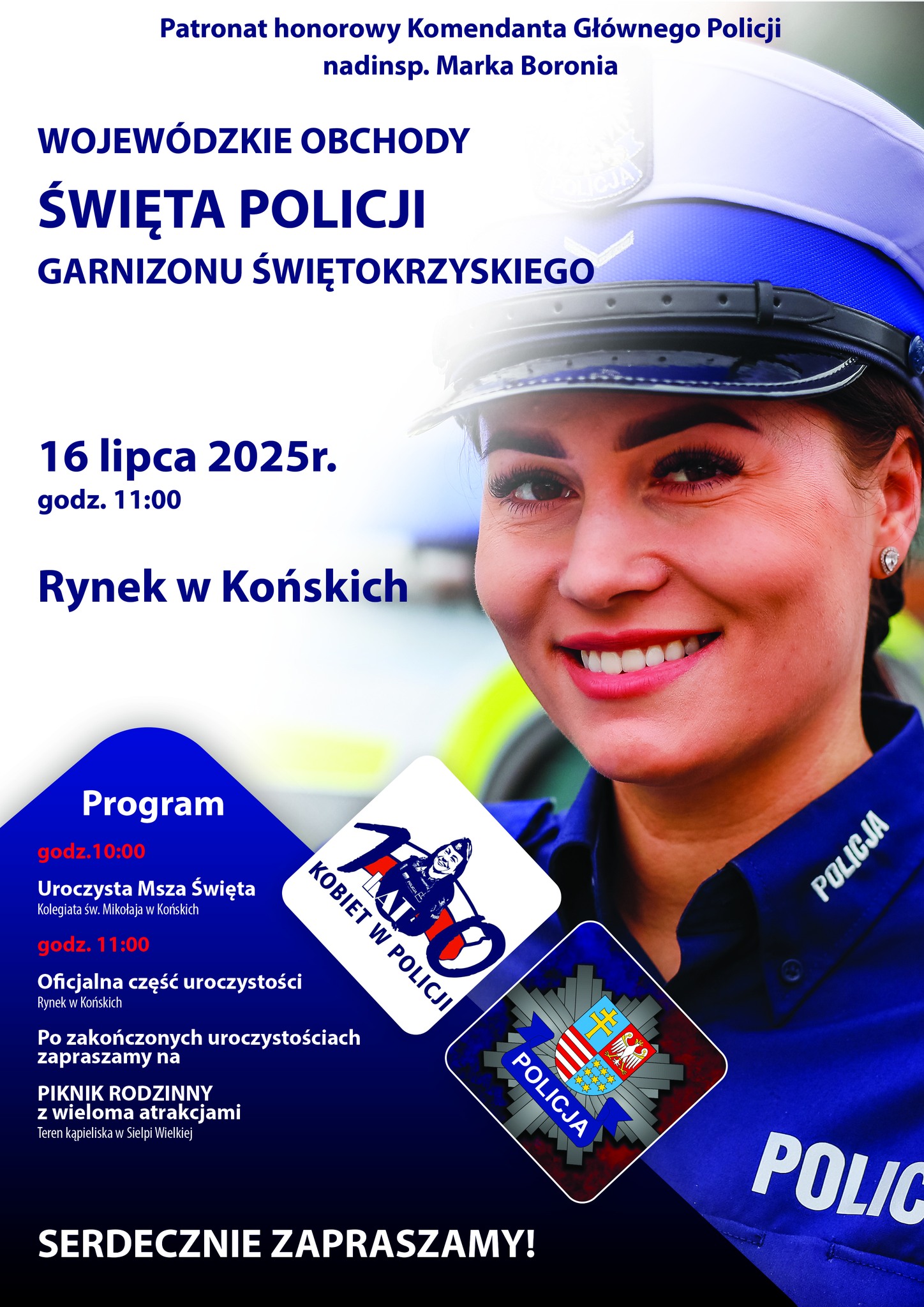 –„Tegoroczne wojewódzkie obchody święta Policji odbędą się właśnie w Końskich oraz w Sielpi Wielkiej. O godzinie 10:00 w Kolegiacie Świętego Mikołaja w Końskich odbędzie się msza święta, po której posterunek honorowy rozpocznie swoją wartę przed pomnikiem Generała Tadeusza Kościuszki. Od godziny jedenastej zacznie się oficjalna część uroczystości, podczas której funkcjonariusze odbiorą odznaczenia oraz awanse, zaś nowo przyjęci policjanci złożą ślubowanie. W tym miejscu będzie można również obejrzeć defiladę i koncert orkiestry Komendy Wojewódzkiej Policji z Katowic. Po zakończeniu tej części wydarzenia zapraszamy wszystkich na rodzinny piknik w Sielpi Wielkiej przy głównym deptaku i na plaży. Tam również czeka nas moc atrakcji. Policjanci przygotowali stoiska profilaktyczne wszystkich komend z terenu województwa świętokrzyskiego, gdzie na zwiedzających będą czekały między innymi symulatory alkogogli, narkogogli, pokazy kryminalistyczne, prezentacja wyszkolenia psów służbowych, tory przeszkód, wirtualna strzelnica, prezentacja sprzętu policyjnego oraz informacje na temat naboru do służby w policji i oczywiście konkursy z nagrodami. Czas będą umilały postacie z bajek z Pacanowa, zaś poszukiwacze dobrego smaku będą mogli zapoznać się z przysmakami z regionalnych kół gospodyń wiejskich. Scena przy plaży również będzie miała liczne atrakcje, takie jak pokaz mody odblaskowej, scenki o bezpieczeństwie, walki rycerskie, pokazy judo i strażackie, teatr, muzyka, występy dzieci, taniec belgijski, występy małych policjantów, opowieści o przyrodzie i bezpieczeństwie. Rozstrzygnięty zostanie również konkurs na maskotkę koneckiej policji. Zapraszamy wszystkich do udziału w wojewódzkich obchodach Święta Policji” – mówi młodszy aspirant Marta Przygodzka, oficer prasowy Komendy Powiatowej Policji w Końskich.