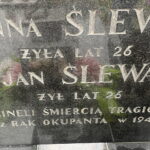 Wchodzimy na teren cmentarza. Zatrzymujemy się tuż przy bramie, gdzie znajduje się pomnik z czerwonego piaskowca. Wyryto na nim nazwiska żołnierzy i osób cywilnych, które oddały swoje życie za ojczyznę. Pomiędzy innymi znajdujemy wyryte litery: Ślewa Anna i Ślewa Jan.