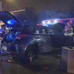 Drugi pojazd, samochód osobowy, również został poważnie uszkodzony. Auto stało przy skrzyżowaniu bez jednego koła, z otwartym bagażnikiem i maską. Wokół widać liczne elementy karoserii rozrzucone po chodniku i jezdni. Na miejscu działają strażacy, policjanci oraz zespół ratownictwa medycznego. Służby zabezpieczają teren i udzielają pomocy uczestnikom zdarzenia. Do szpitala zostali zabrani zarówno policjanci, jak i kobieta z drugiego pojazdu.