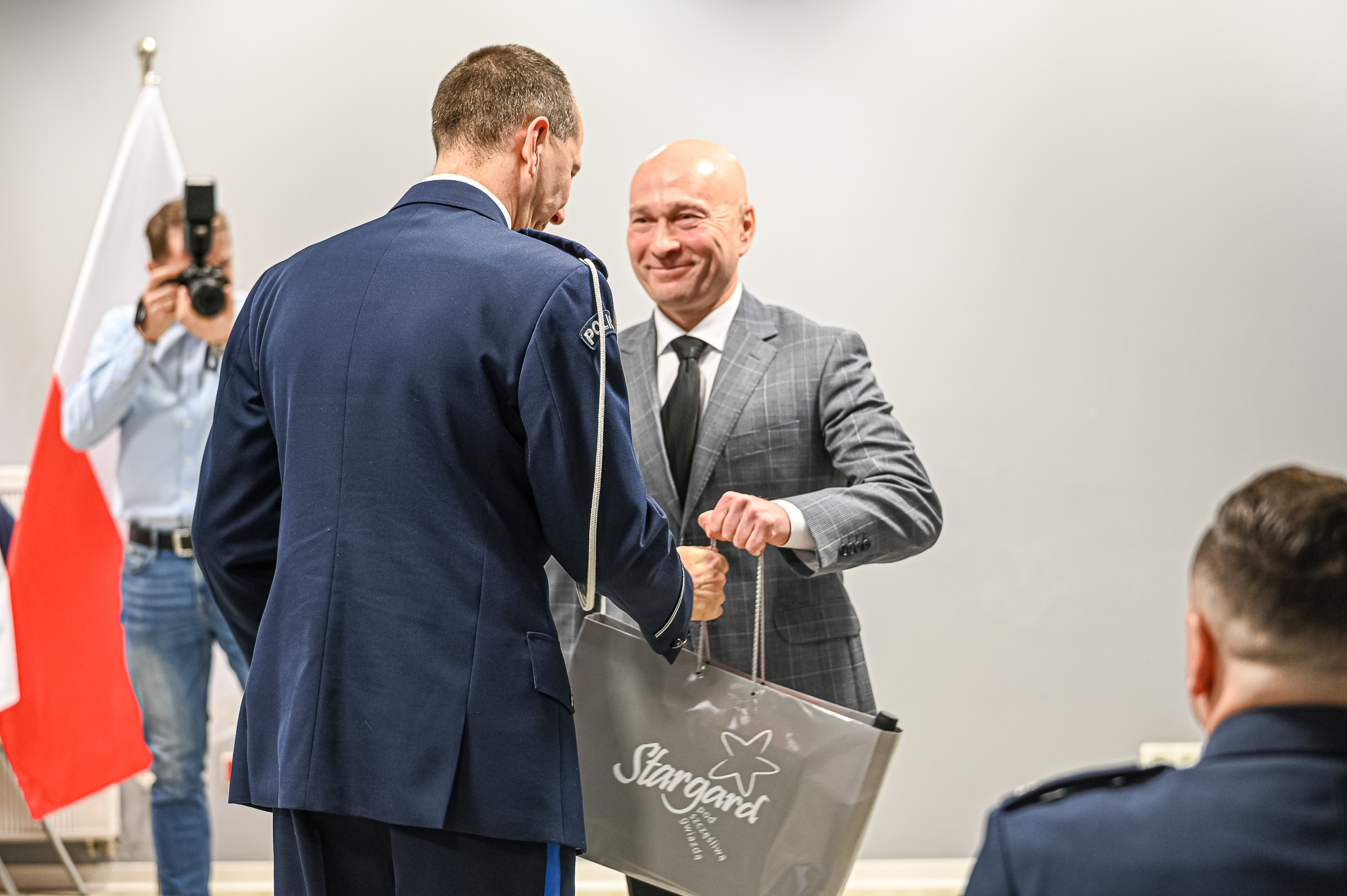 Spotkanie było również okazją do pożegnania dotychczasowego komendanta KPP. Sławomir Bober pełnił tę funkcję od 2022 roku. – Zaszczytem było dla mnie działanie z człowiekiem, który jest policjantem z powołania, doskonale rozumie ludzi, ich potrzeby i cały interes publiczny. Jestem przekonany, iż kilkuletnia praca komendanta w Stargardzie bardzo wyraźnie zapisze się w historii tej jednostki. Świadczą o tym zarówno konkretne liczby i statystyki, ale także, a może przede wszystkim, wysokie poczucie bezpieczeństwa wśród mieszkańców. Dziękuję za świetną współpracę i życzę kolejnych sukcesów w nowym miejscu – mówi prezydent Rafał Zając. Pełniącym obowiązki komendanta KPP został Emil Ubych, do tej pory I zastępca Sławomira Bobera.